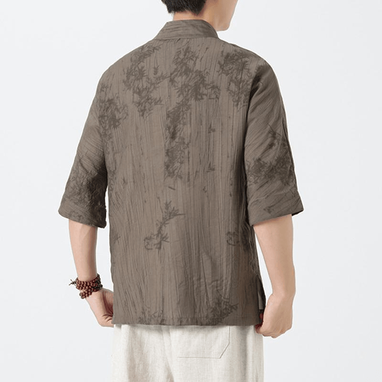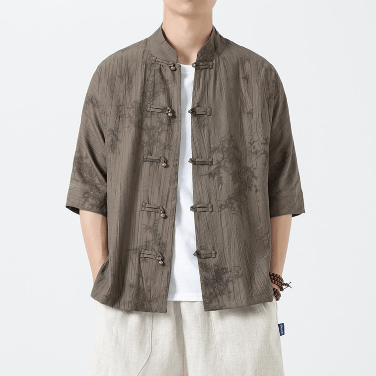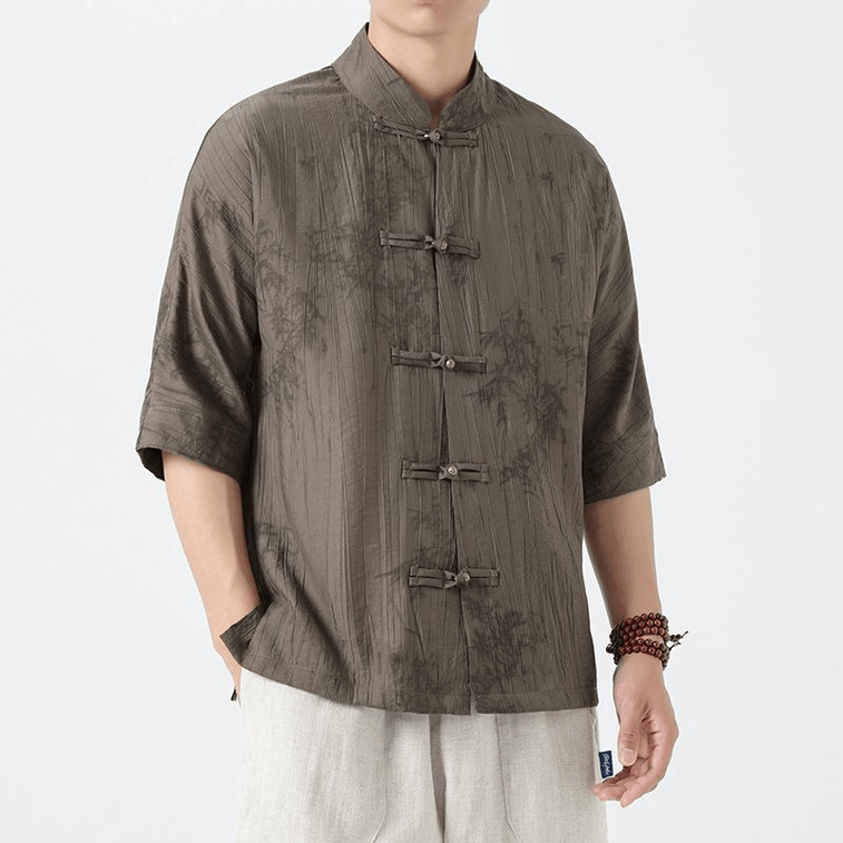 【中国直邮】 ASIS 新中式冰丝薄款印花盘扣中袖唐装衬衫-深灰色 L | 亚米