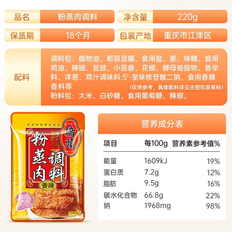 【中国直邮】 重庆桥头 桥头 香辣粉蒸肉米粉肉调料(买一送一)到手2袋同款 220g*2 麻辣川菜调料 蒸鱼 排骨调料 220g*2