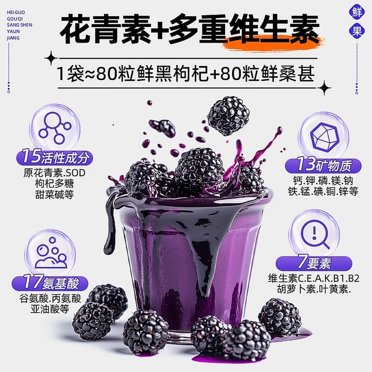 桑葚富含花青素、白藜芦醇、维生素E等抗氧化成分,能清除自由基,延缓细胞老化 。北京医院专家指出,其抗氧化能力是蓝莓的3-5倍 。