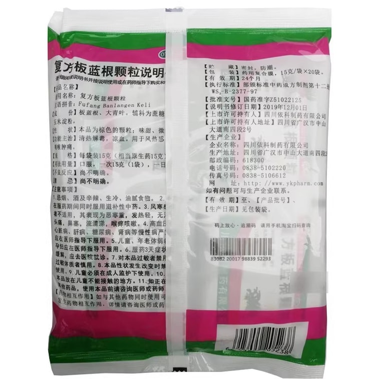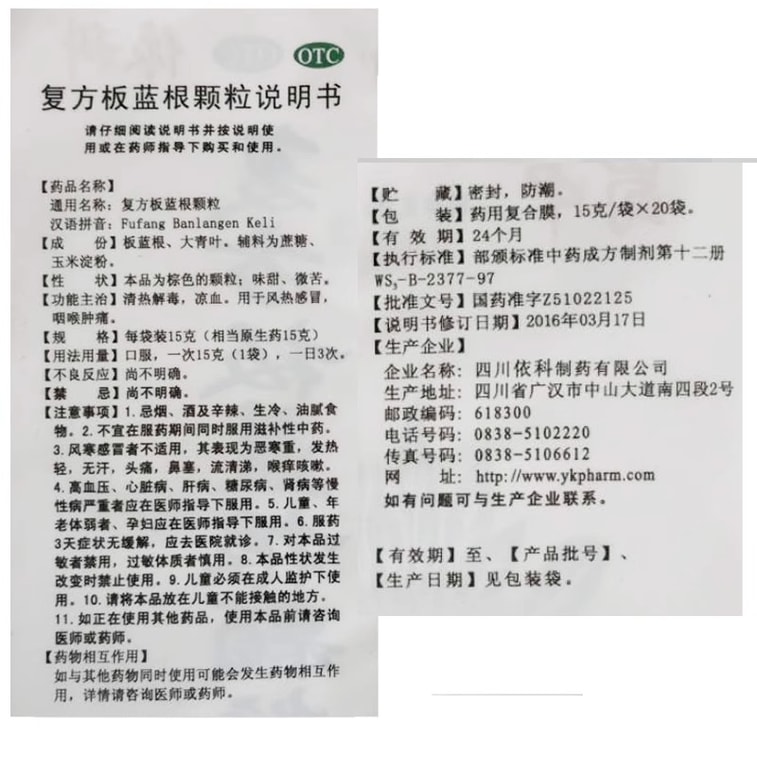 【中国直邮】 蜀中 复方板蓝根颗粒 冲剂感冒药感冒冲剂咽喉肿痛发热咳嗽风热感冒20袋/包