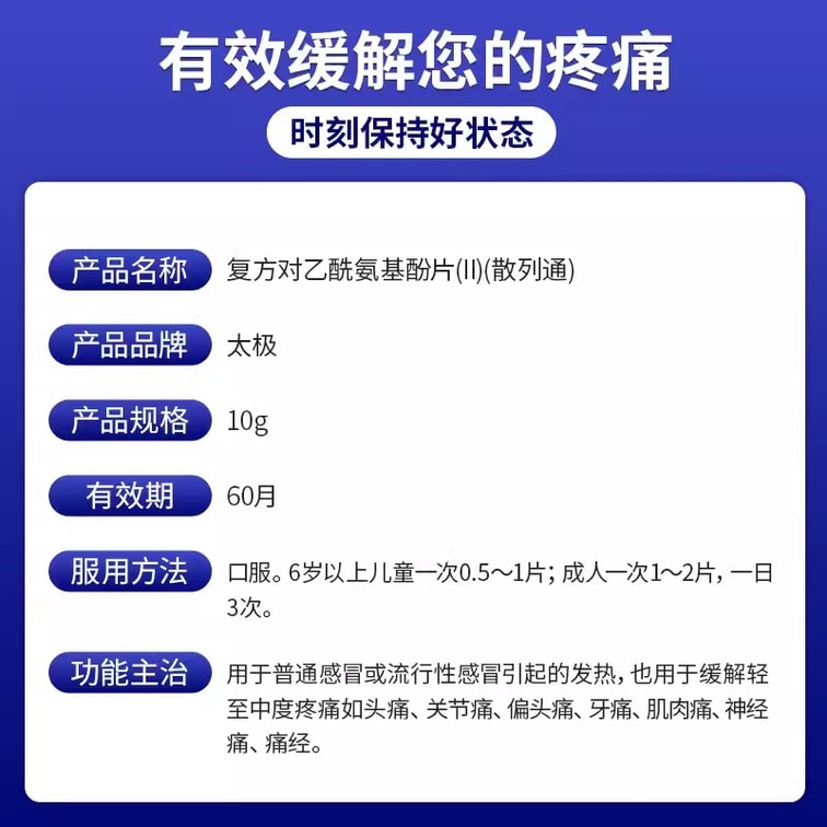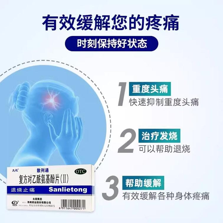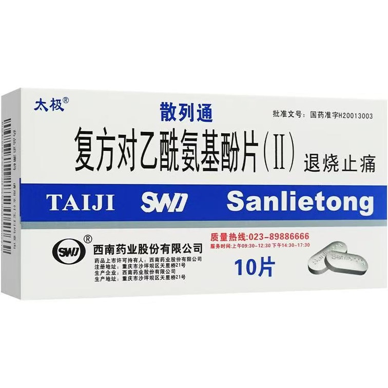 【中国直邮】 太极 复方对乙酰氨基酚片 散列通退烧药头痛药感冒止痛药 10片/盒(家中常备药品)