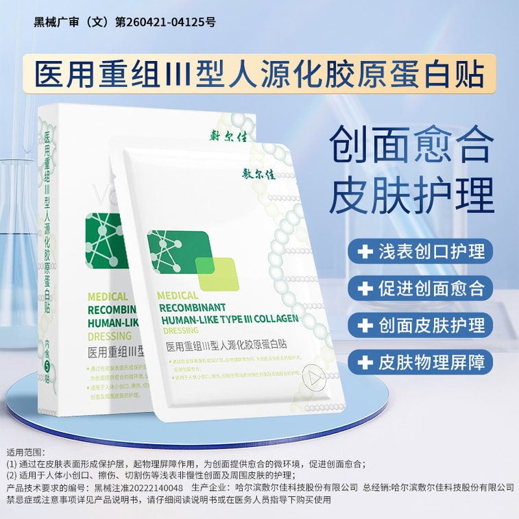 【中国直邮】敷尔佳 医用重组III型人源化胶原蛋白贴 械敷料护理愈合修复非面膜 医美后修护敏感肌适用 25g*5贴【浅表创口护理 促进创面愈合】