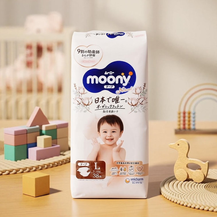 日本MOONY尤妮佳 尿不湿尿布 L号9-14kg 38枚 男女通用 皇家系列臻粹有机棉系列 婴儿腰贴纸尿裤