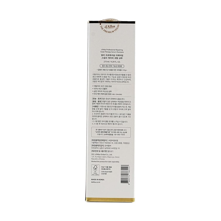 韩国D'ALBA黛尔珀 头皮修护精华洗发水 纯素 275ml 抗氧化滋养 柔顺光泽 改善发质防脱 敏感头皮使用