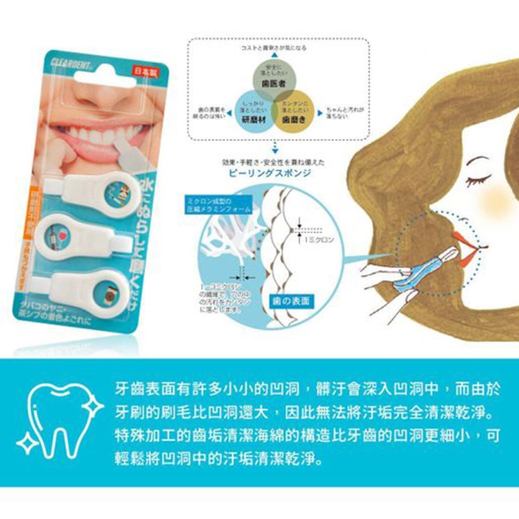 【日本直邮】 日本 CLEARDENT 微米洁牙擦 牙齿海绵橡皮 牙齿去黄亮白海绵刷 3个入