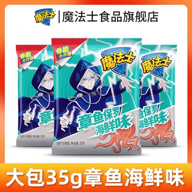 【中国直邮】 魔法士 干脆面整箱装干吃面大包装35g怀旧晚上解饿解馋小零食小吃休闲食品 章鱼保罗海鲜味35g*6袋