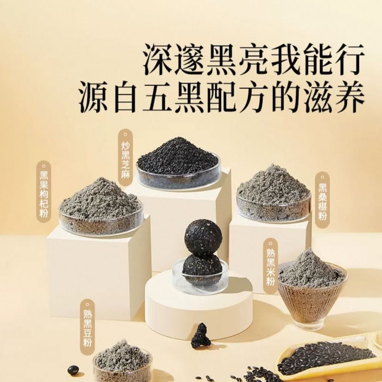 采用炒黑芝麻、黑桑椹粉、黑果枸杞粉、熟黑米粉、熟黑豆粉与少量人参黄精草本膏精制而成。