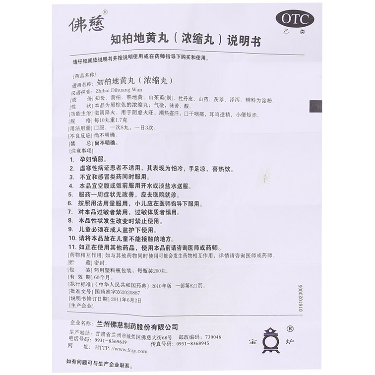 佛慈 知柏地黄丸 滋阴降火 阴虚火旺 潮热盗汗 口干咽痛 耳鸣遗精 200粒