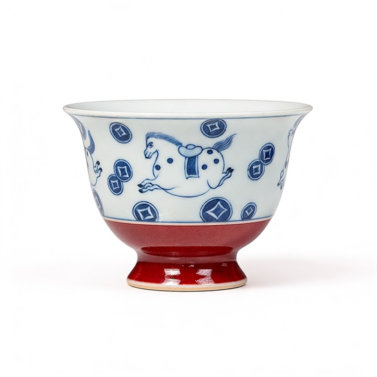 这只 马上有钱 青花宣德红 石榴杯 造型雅致,寓意吉祥,兼具传统文化内涵与实用美感。杯身以温润细腻的白釉为底,外壁绘以青花纹饰:一匹灵动可爱的骏马昂首奔腾,马背上驮着元宝,象征财富随行、好运在身;马身周围点缀着圆形铜钱纹样,铜钱错落分布,寓意财源环绕、生生不息。“马上有钱”一语双关,既是“立刻有钱”,也是“马背上有钱”,寄托了人们对富足与顺遂生活的美好祝愿。杯底施以宣德红釉,红色沉稳而不张扬,与清雅的青花形成鲜明对比,既有喜庆之意,又显古朴格调。整体线条简洁,比例协调,小巧而不失端庄,握持舒适,适合日常品茗,也十分适合作为新年贺礼或吉祥收藏杯。