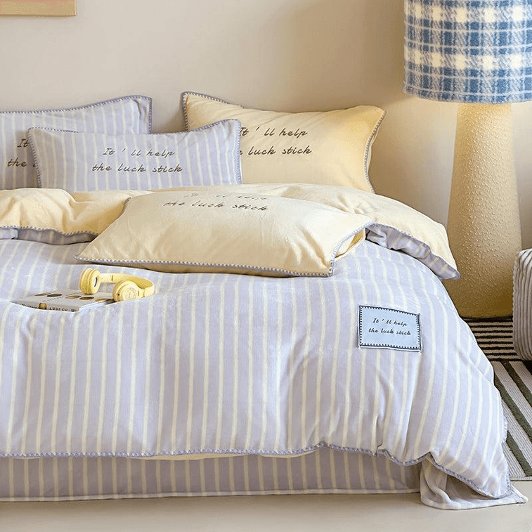 【中国直邮】 Lullabuy 撞色格子条纹床上四件套 床品被套枕套(床笠款)葡萄奶昔-Queen