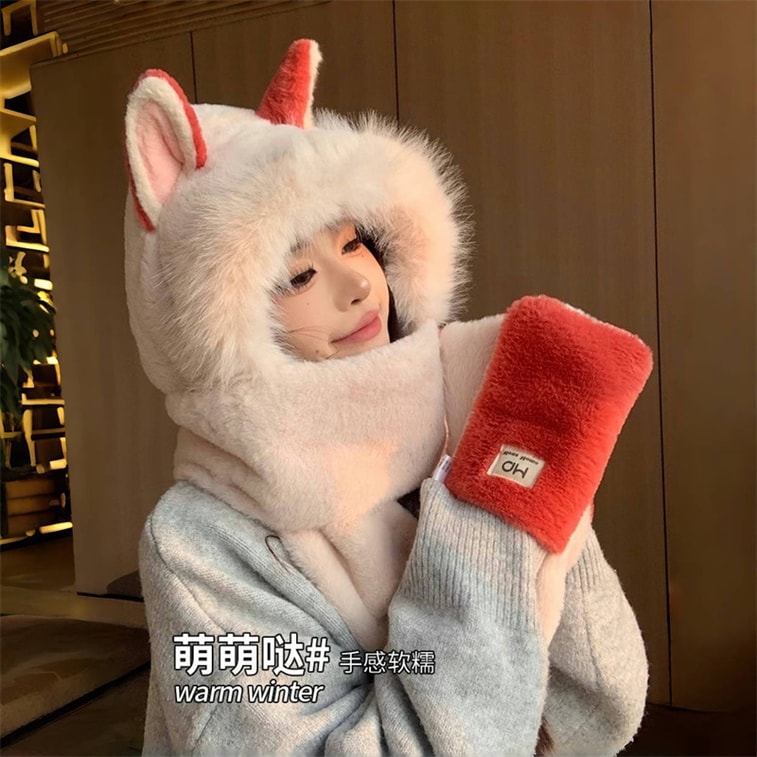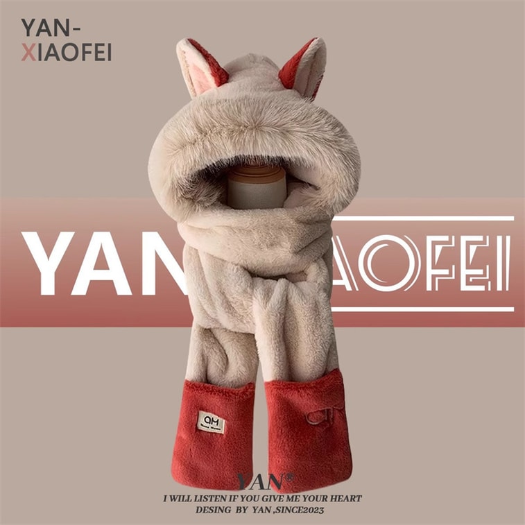 FOXTAIL 毛茸茸火狐狸一体帽 帽子 围巾 手套 冬季 保暖 防风 围脖 连帽 1个 | 亚米