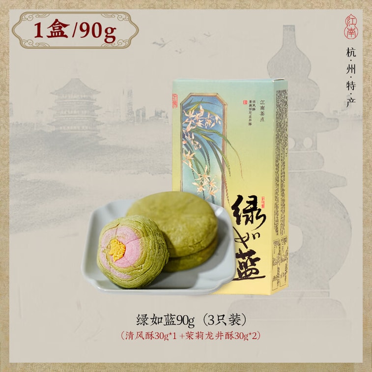 【中国直邮】 知味观 绿如蓝(清风酥30g+茉莉龙井酥30g*2) 杭州特产中式茶糕点心 休闲零食 90g