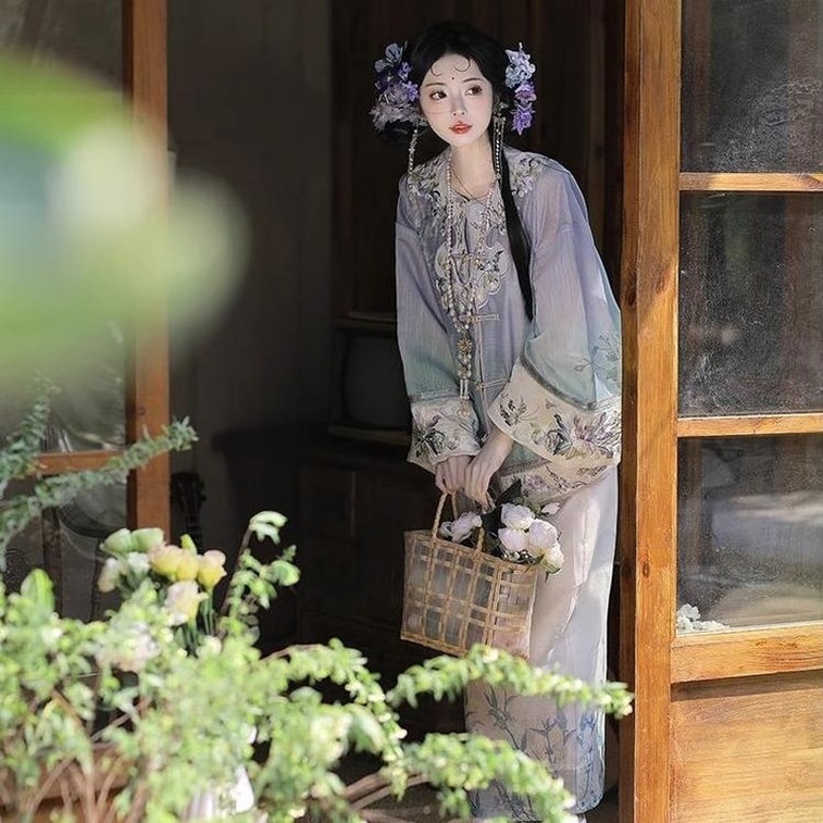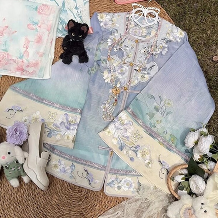 【中国直邮】 FOXTAIL 重工刺绣新中式国风汉服 清汉 女印花 渐变 套装 复古 -蓝色 M码 1套
