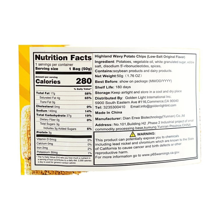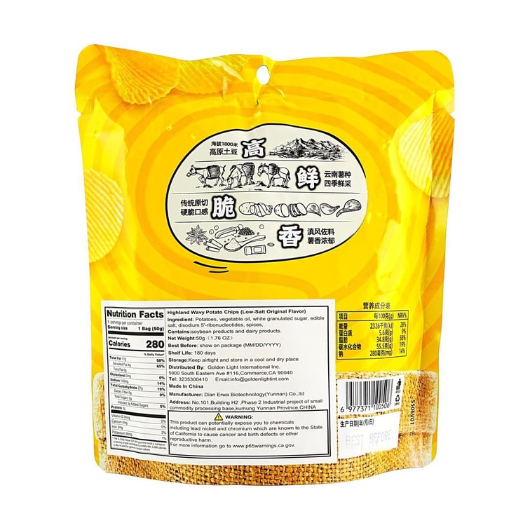 滇二娃 高原波浪土豆片 薯片 薄盐原味 50g【云南特产】