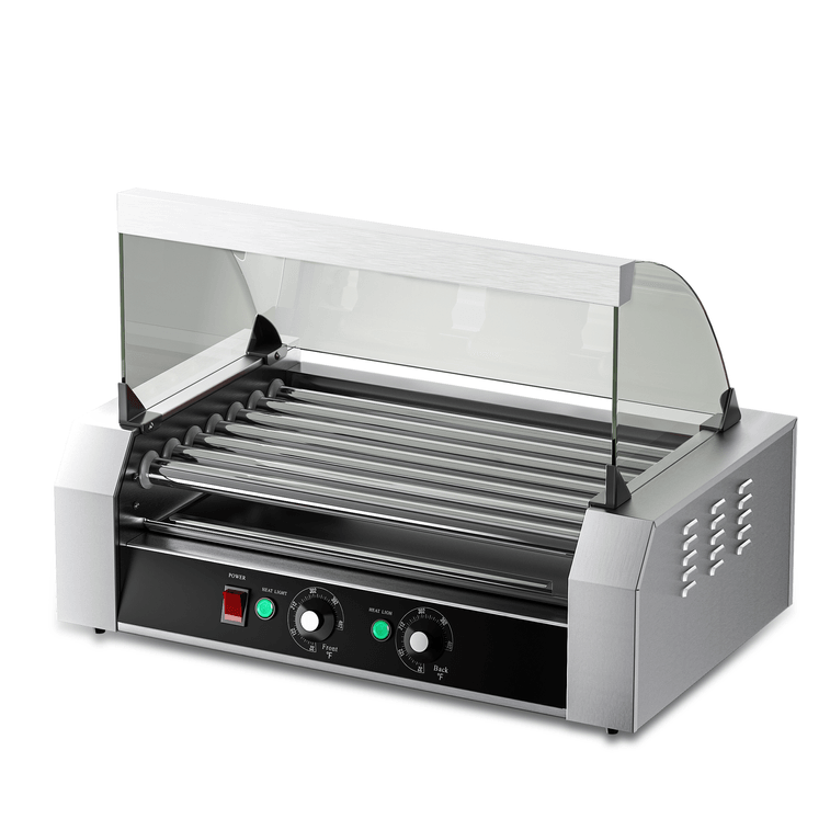 商用级不锈钢烤架,品质卓越,7 个不粘滚筒可同时烘烤多达 18 根热狗
