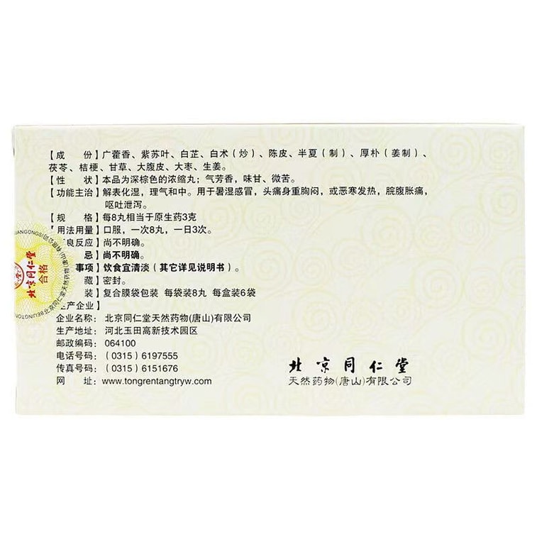 北京同仁堂 同仁堂 藿香正气丸 (浓缩丸) 8丸*6袋解表化湿理气和中外感风寒内