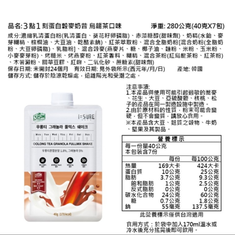 3:15PM 三点一刻 I SURE 乌龙茶蛋白谷麦奶昔7包入280g