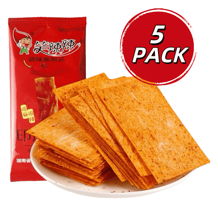 【中国直邮】 笑辣辣 印度飞饼辣条干辣片硬质脆大辣片老式童年怀旧休闲零食 很麻很辣 14g*5包