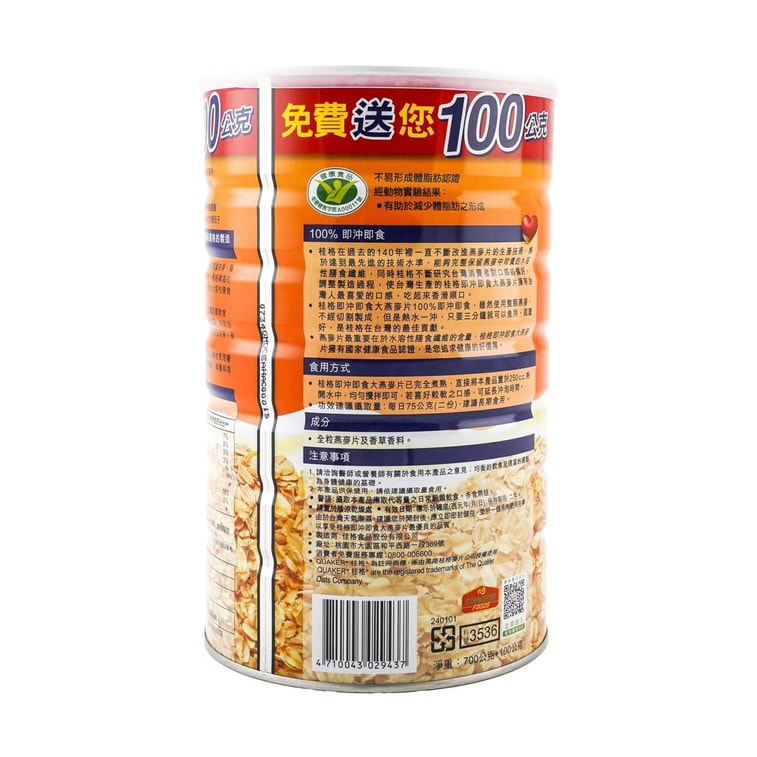 桂格 大燕麦片 700g【即冲即食免煮早餐代餐】