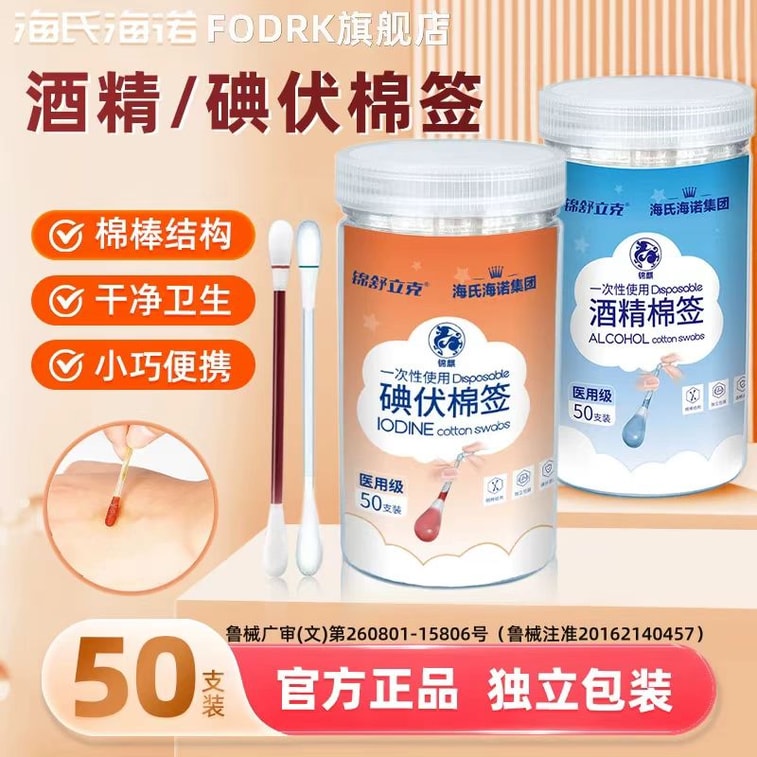 海氏海诺 碘伏棉签 饱满棉头 柔软亲肤 消毒液含量高 一折即用 简单便捷 50支