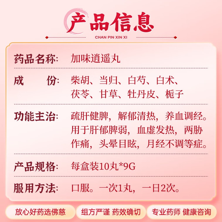 【中国直邮】 佛慈 加味逍遥丸(大蜜丸) 9g*10丸 舒肝清热 健脾养血 两胁胀痛 心烦易怒 倦怠食少 月经不调