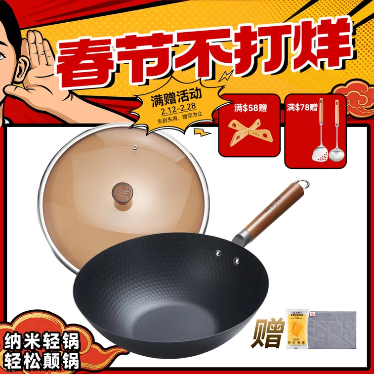 王源吉 ⭐超轻设计! 女士男士单手轻松拎起⭐【可无需开锅】 32cm 仅重1.1KG 轻量炒锅 无涂层 轻松颠锅! 不挑炉灶完全适用!