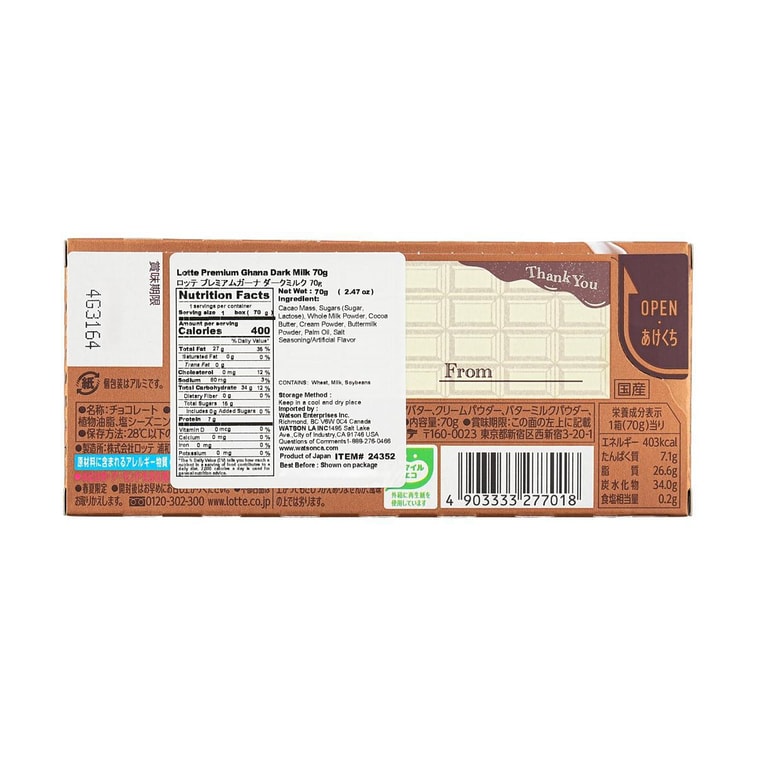 日本LOTTE乐天 GHANA加纳 牛奶黑巧克力 70g