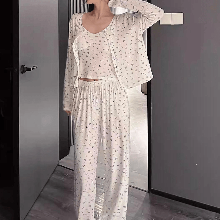 【中国直邮】 Lullabuy 花漾小憩冰丝睡衣三件套女士家居服 小碎花白-XL码