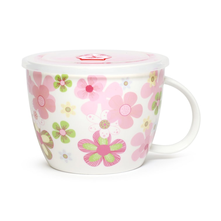 GINKGOHOME 手绘可爱动物 陶瓷便当盒面碗带盖可微波 精美陶瓷餐具 粉色樱花 24oz