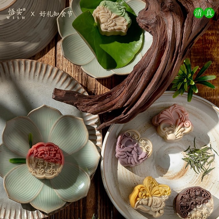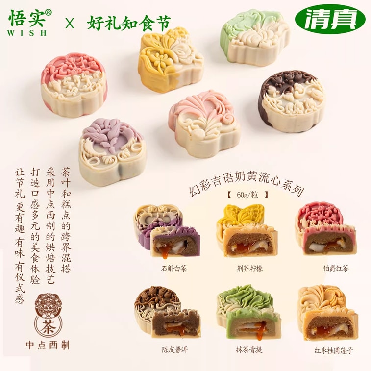 【中国直邮】 悟实 「幻彩吉语」奶黄茶流心月饼桃山皮茶点 散装6个6味中式糕点手工月饼 | 亚米