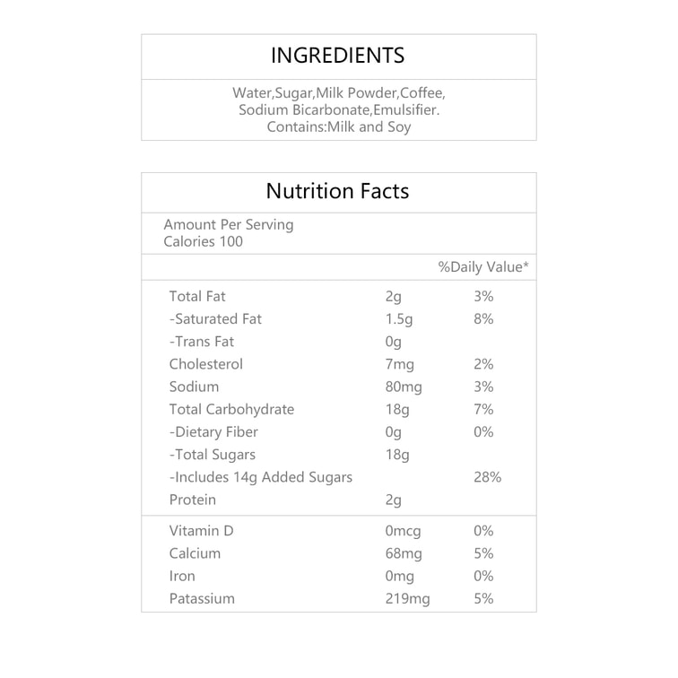 | 原料成分 | 水、糖、奶粉、咖啡等。 |