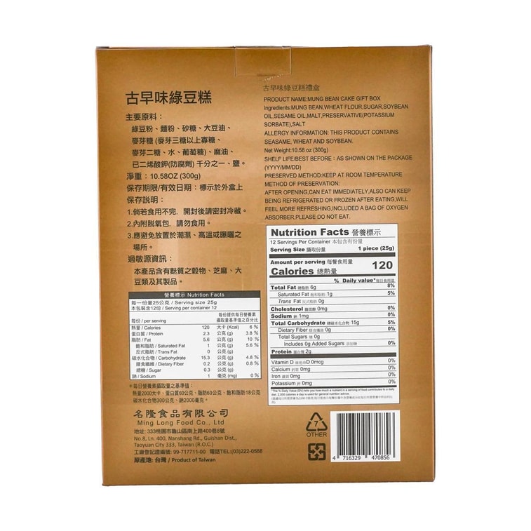 台湾名隆 古早味绿豆糕礼盒 300g【纯素食】【台湾特产伴手礼】