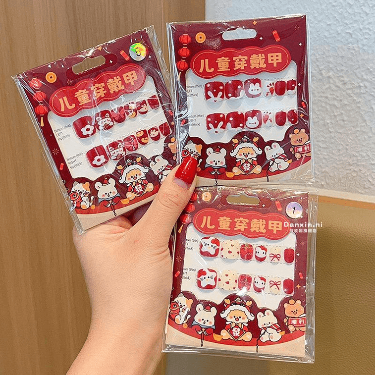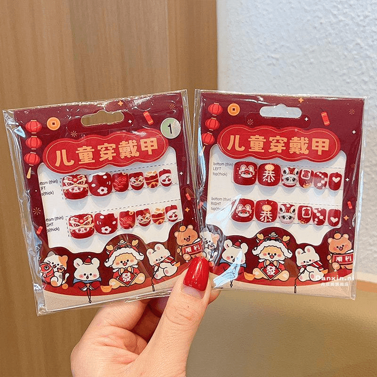 【中国直邮】 西坞 儿童新年红色指甲贴自粘穿戴甲片美甲贴果冻胶发财+醒狮穿戴甲5-10岁均码6cm*2件