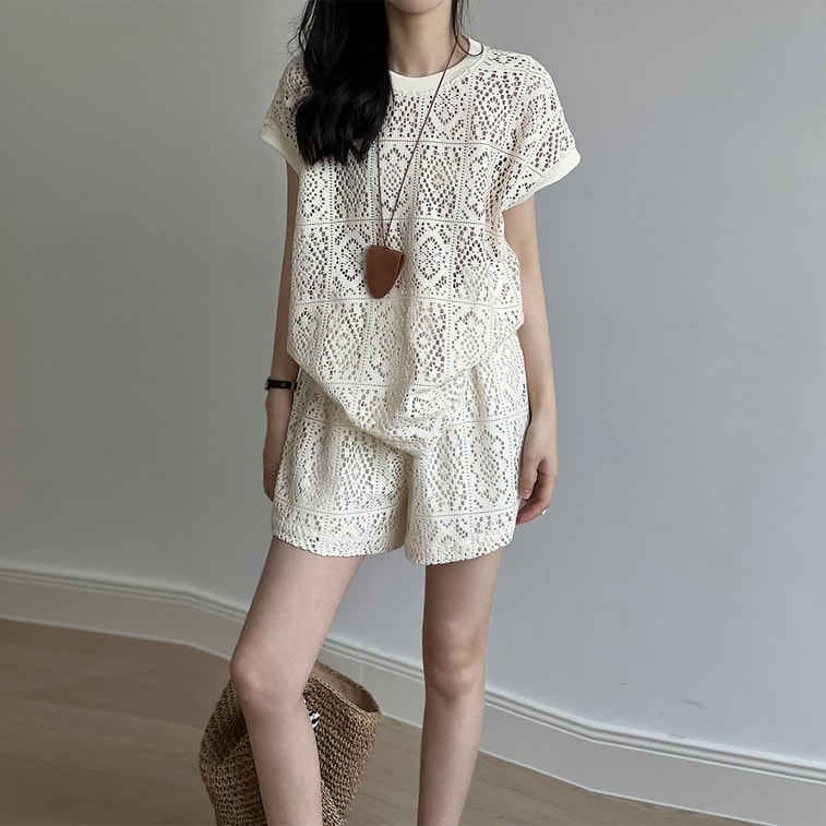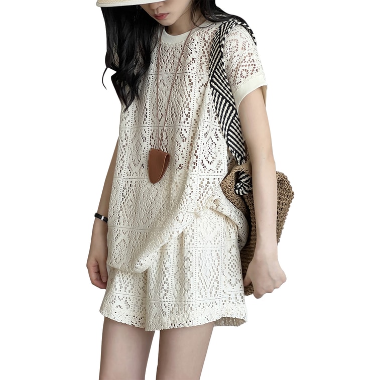 【中国直邮】 HSPM 新款休闲宽松设计感镂空T恤短裤套装 米白色 M