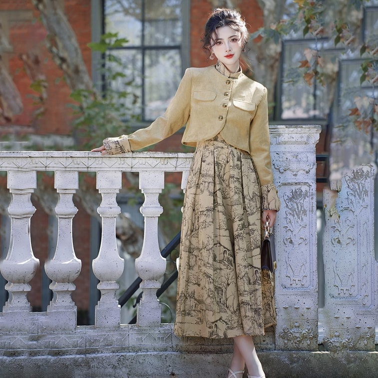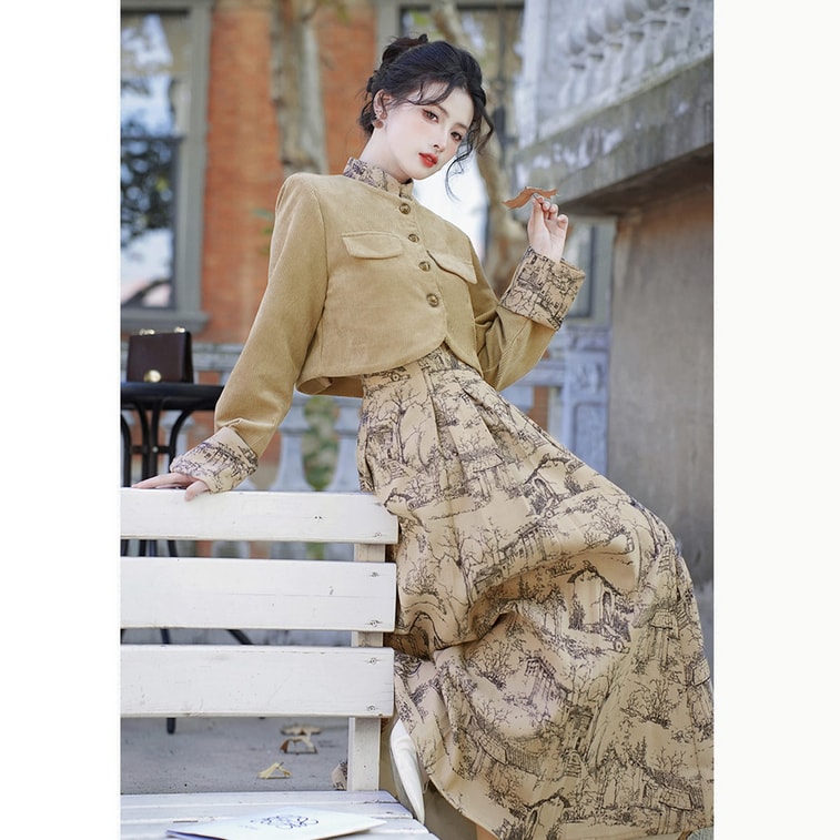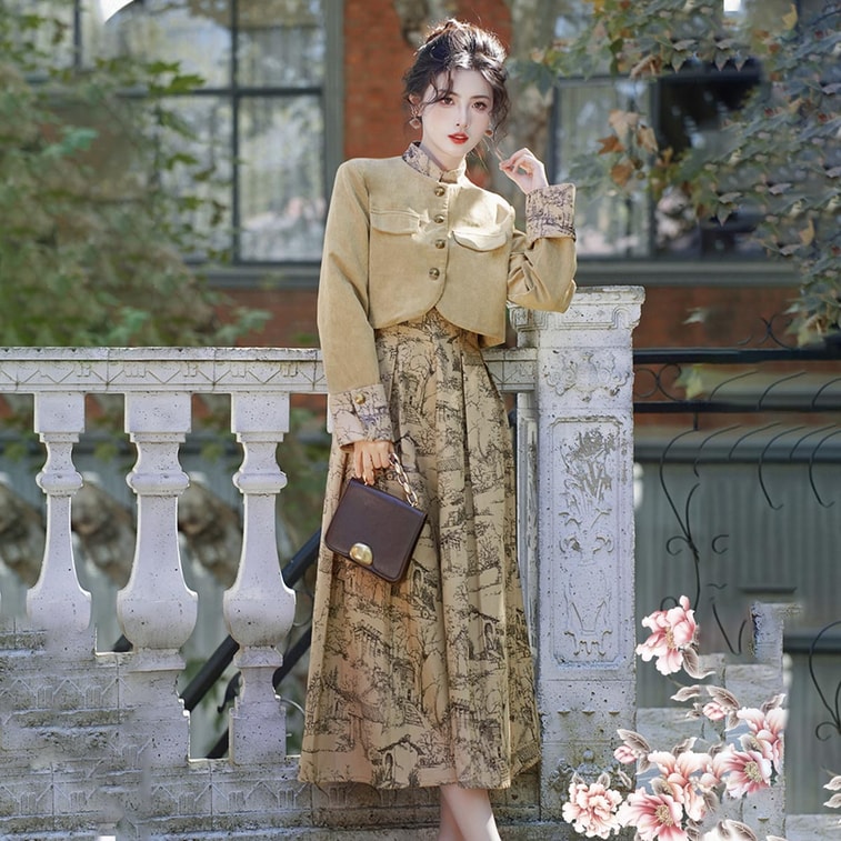 【中国直邮】 HSPM 新中式女装国风清冷感水墨套装 卡其灰套装 S