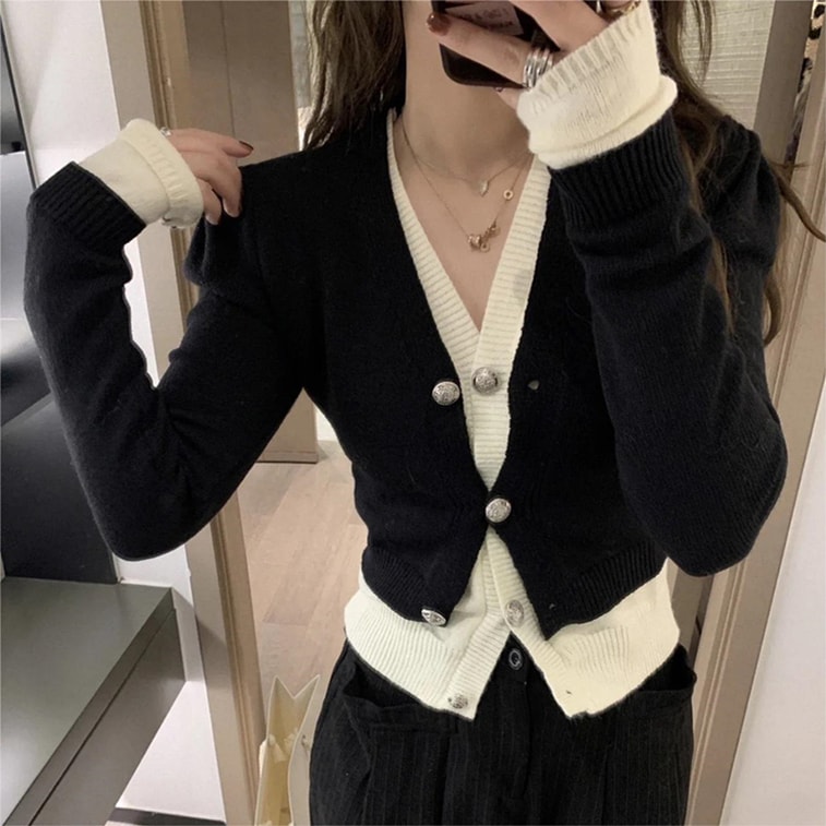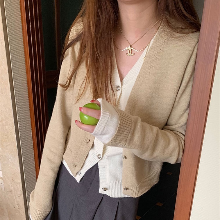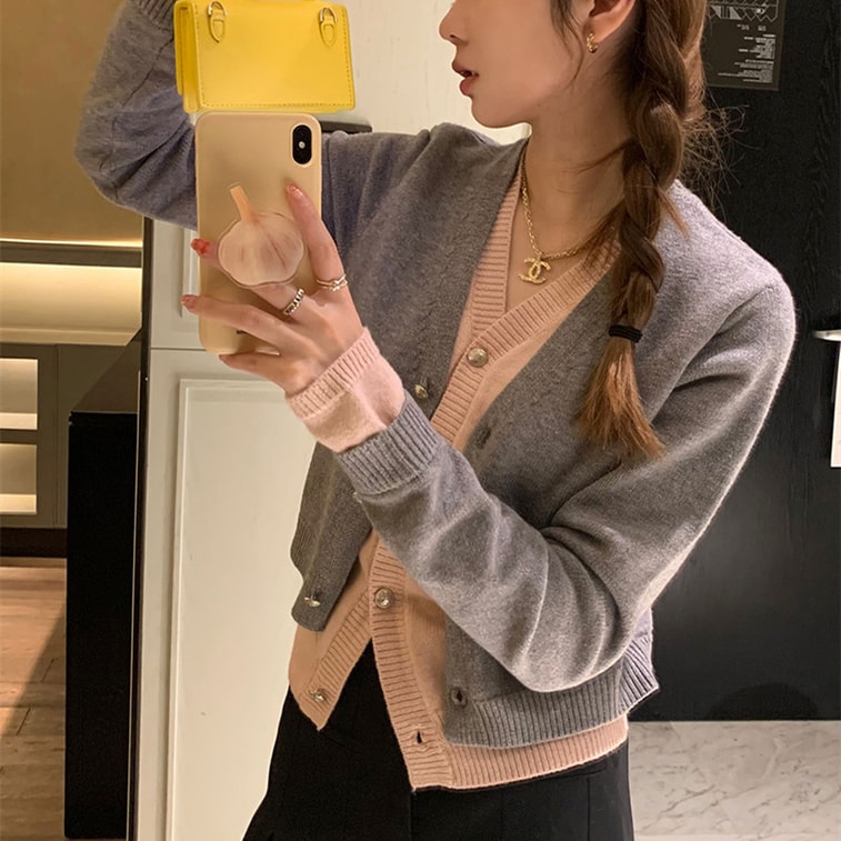 【中国直邮】 奢笛熊 新款慵懒风假两件V领针织开衫宽松显瘦百搭上衣 灰色 均码