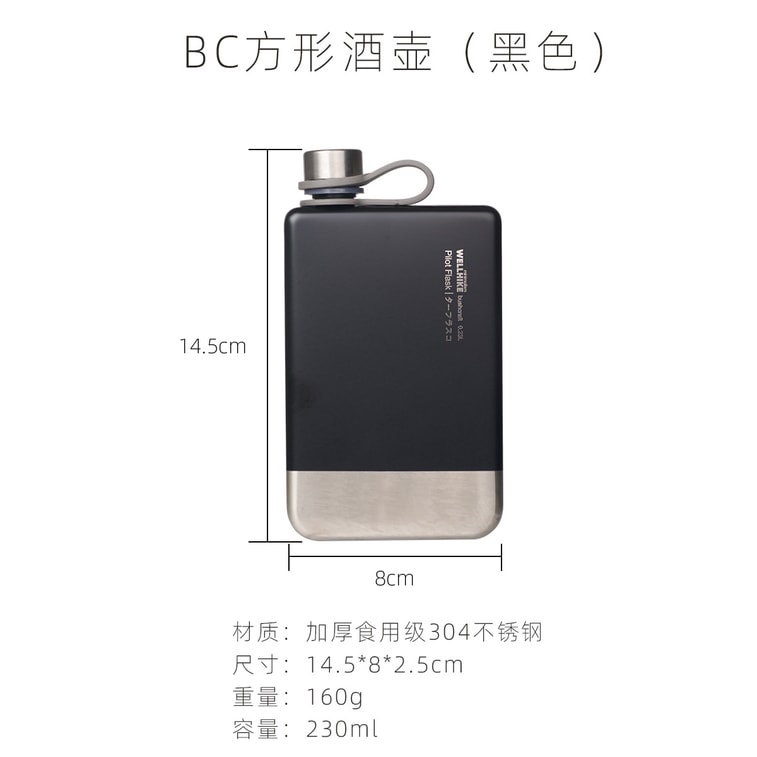 【中国直邮】 HSPM 新款户外露营304不锈钢随身户外便携式扁酒瓶 230ml 方形酒壶黑色
