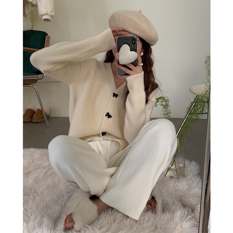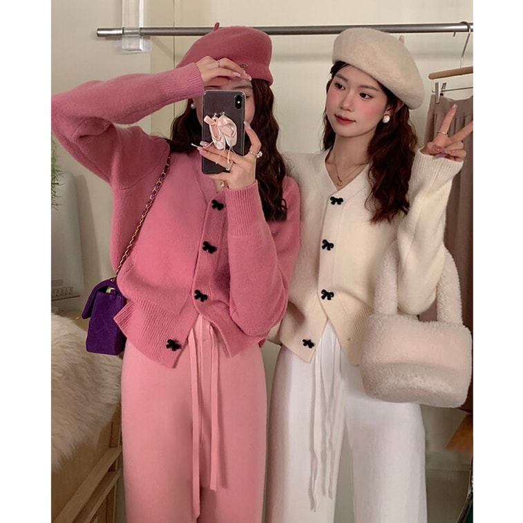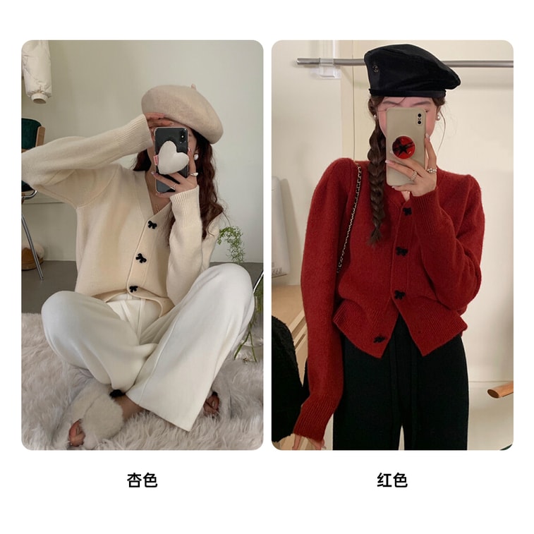 【中国直邮】 HSPM 新款气质甜美V领蝴蝶结百搭针织衫 杏色 M