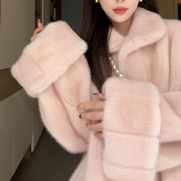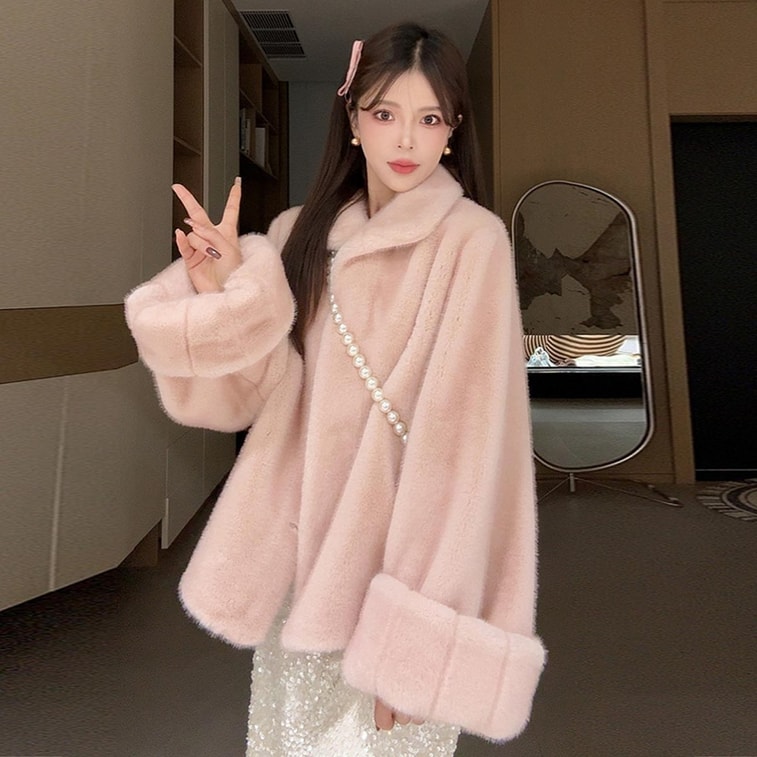 【中国直邮】 HSPM 新款加厚短款方领南瓜挽袖中古仿水貂毛绒外套 粉色 M