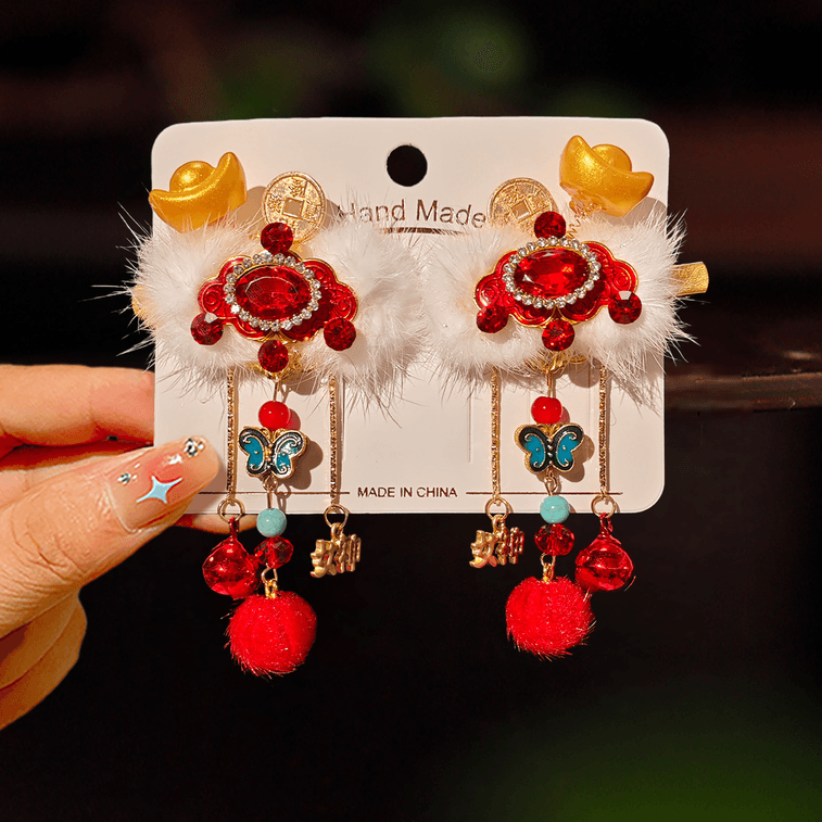 美佳严选 新年红色儿童发夹古风风拜年发饰【绒宝吉岁】-1对 | 亚米