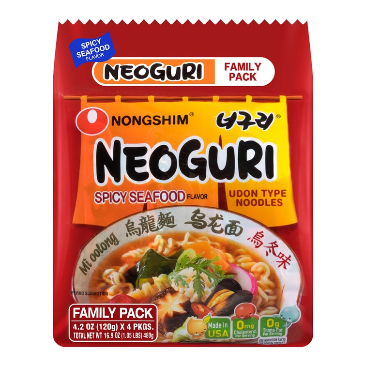 韩国NONGSHIM农心 NEOGURI 小浣熊乌龙面 乌冬面拉面 辣海鲜味 4包入 480g【BTS田柾国同款】