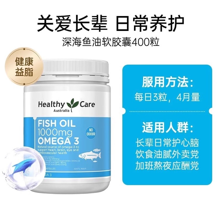 【中国直邮】 澳大利亚 Healthy Care omega3深海鱼油软胶囊 中老年DHA补脑呵护 400粒/瓶【强劲护心脑】