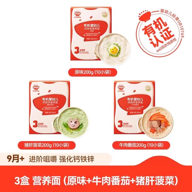 【中国直邮】 秋田满满 有机儿童辅食营养面 宝宝面条 原味+牛肉番茄+猪肝菠菜200g*3盒