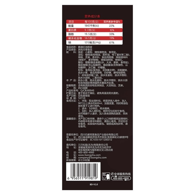 【中国直邮】 三只松鼠 霸道红油面皮 泡面宽面免煮速食 优选宽面皮筋道爽滑 红油酱汁浓郁够味 115g