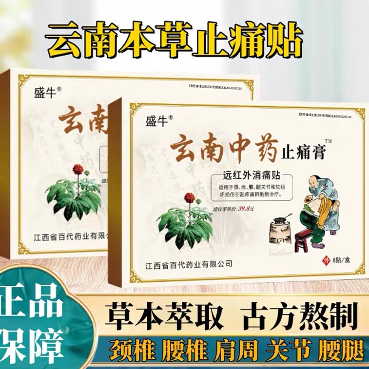 盛牛 云南中药 止痛膏药 - 肌肉痛 颈椎痛 颈肩 腰椎关节膝盖疼痛 万痛筋骨贴 8片