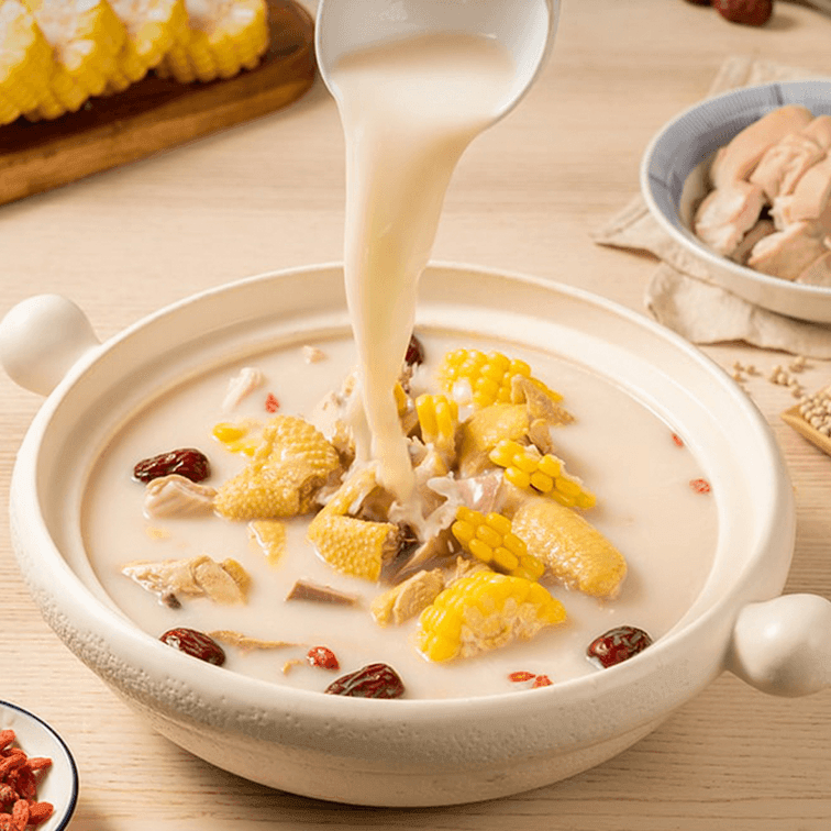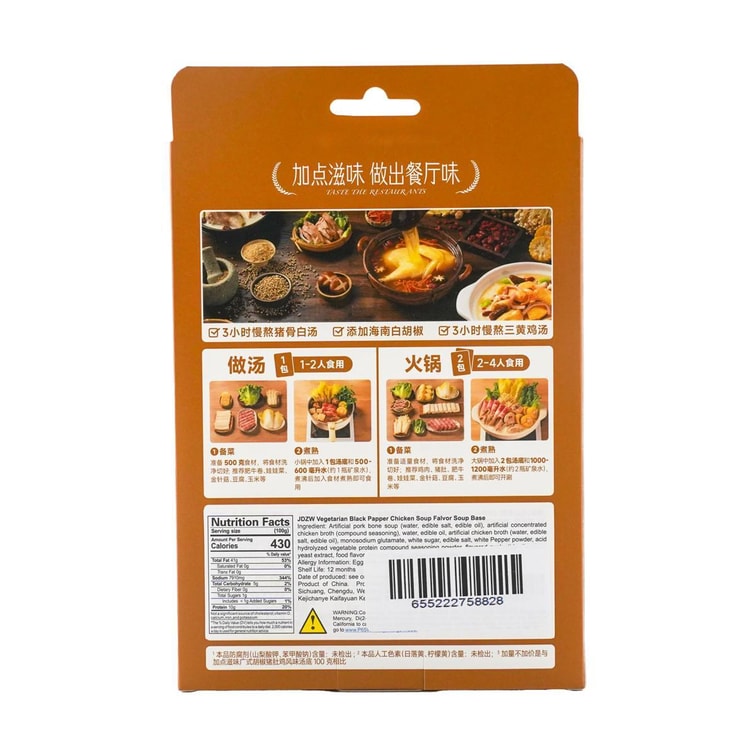 | 食用方法 | 猪肚鸡火锅: 1.备菜:准备500g左右的食材,推荐鸡肉、猪肚、肥牛、娃娃菜、金针菇、豆腐、玉米等 2.煮熟:锅内加入500-600ml水喝一袋汤底包,放入食材,涮煮即可 温馨提示:1-2人使用1袋汤底搭配500-600ml水;2-4人使用2袋汤底加入1000-1200ml水 |