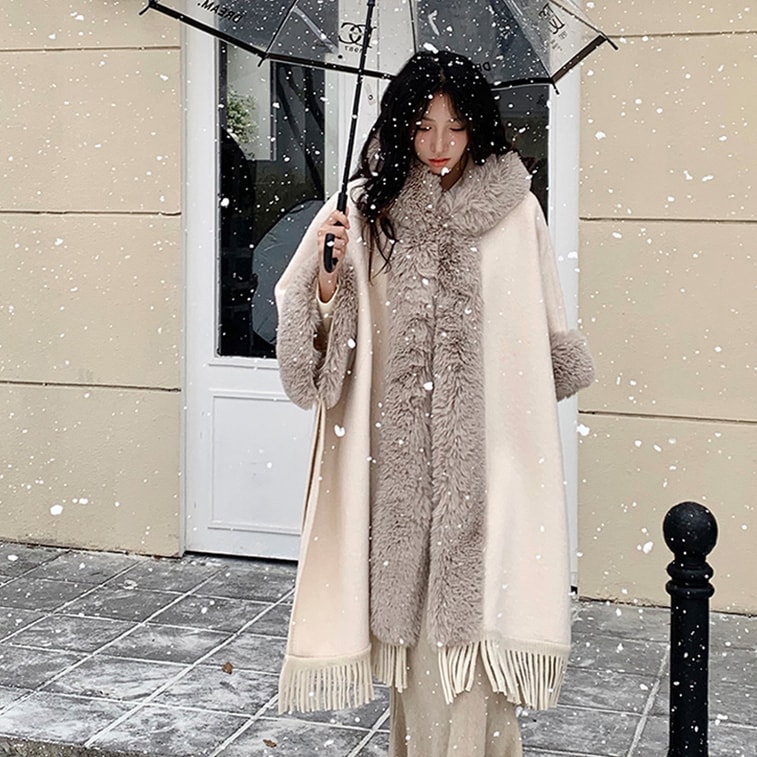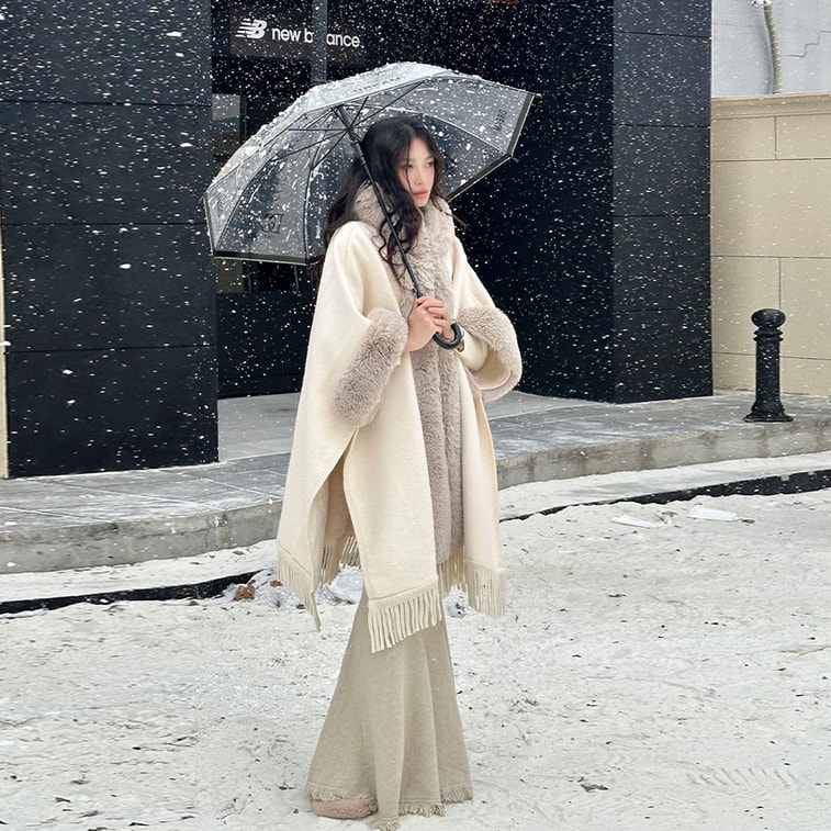 【中国直邮】 HSPM 毛绒斗篷大衣披肩女冬季高级加厚保暖毛领新中式国风毛呢流苏外套 1件