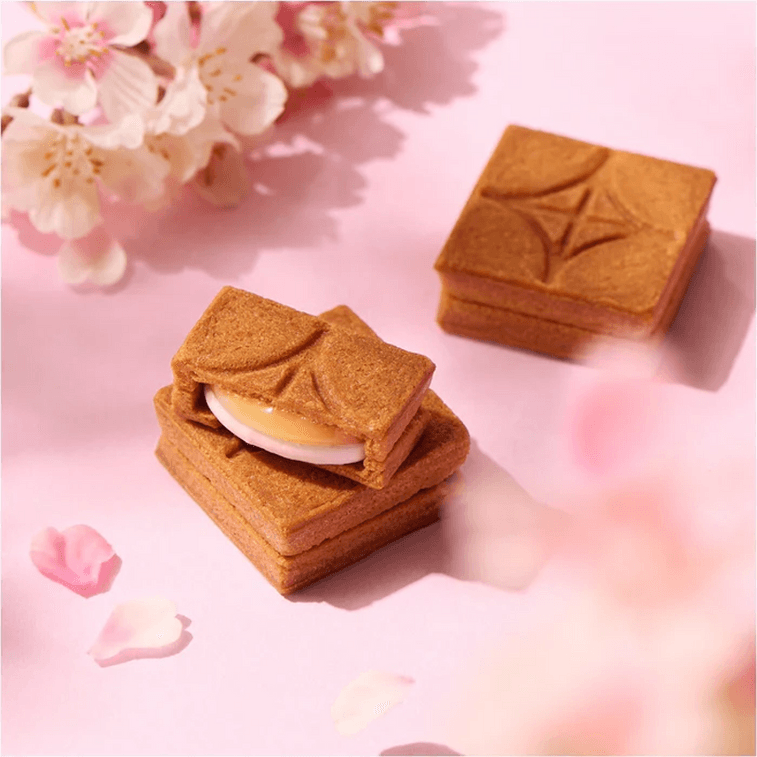 一款全新的樱花黄油三明治,让你感受到春天的到来!樱花奶油霜,用草莓酱和樱花粉制成,经典的黄油焦糖夹在酥脆的樱花香味饼干之间。