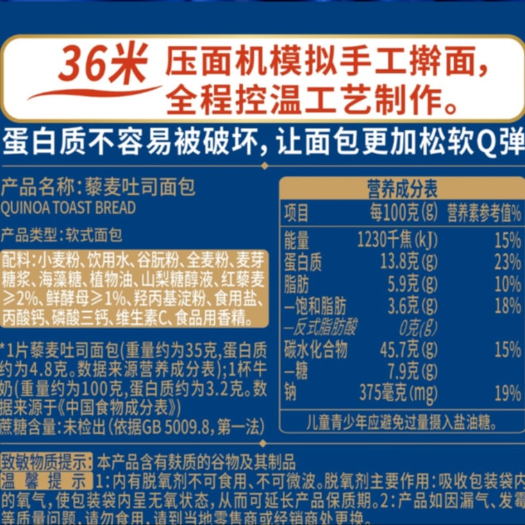 【中国直邮】 豪士 藜麦吐司面包420g*1箱【约11包】零食整箱早餐点心速食食品