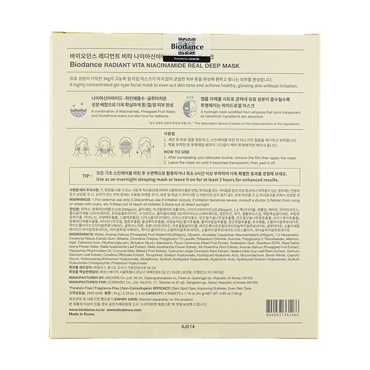 韩国BIODANCE 黄色维他命烟酰胺深层水凝胶面膜 4片*3 美白透亮 均匀肤色 改善粗糙毛孔 补水低刺激 需敷3小时可过夜【超值装】